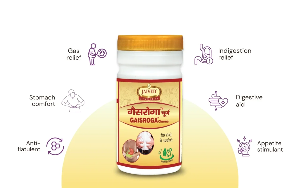 Gaisroga Churna is a natural remedy for gas and indigestion, made with Amla, Choti Harad, Pippli, Bel, Kala Jeera, and five other powerful herbs to promote healthy digestion and relieve bloating