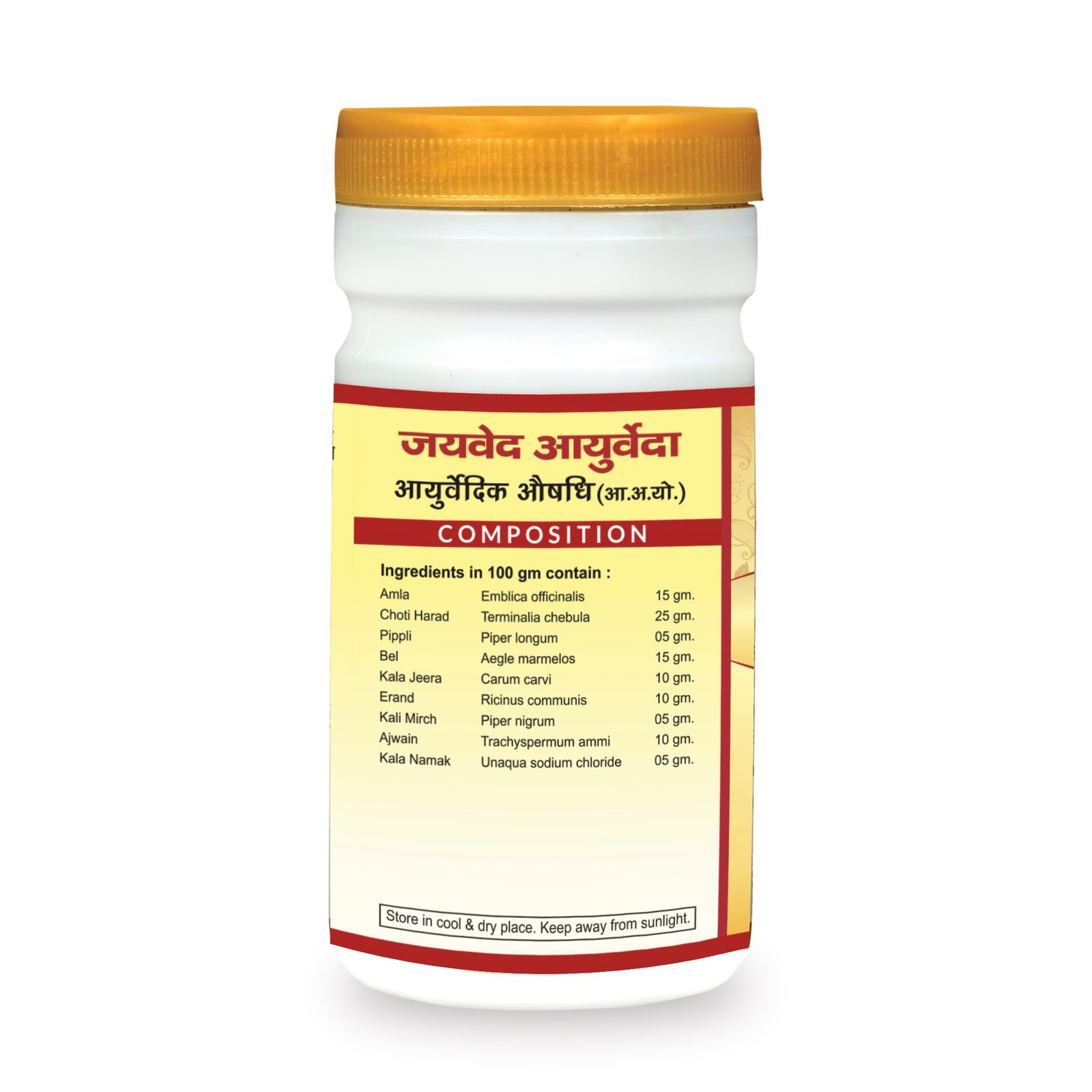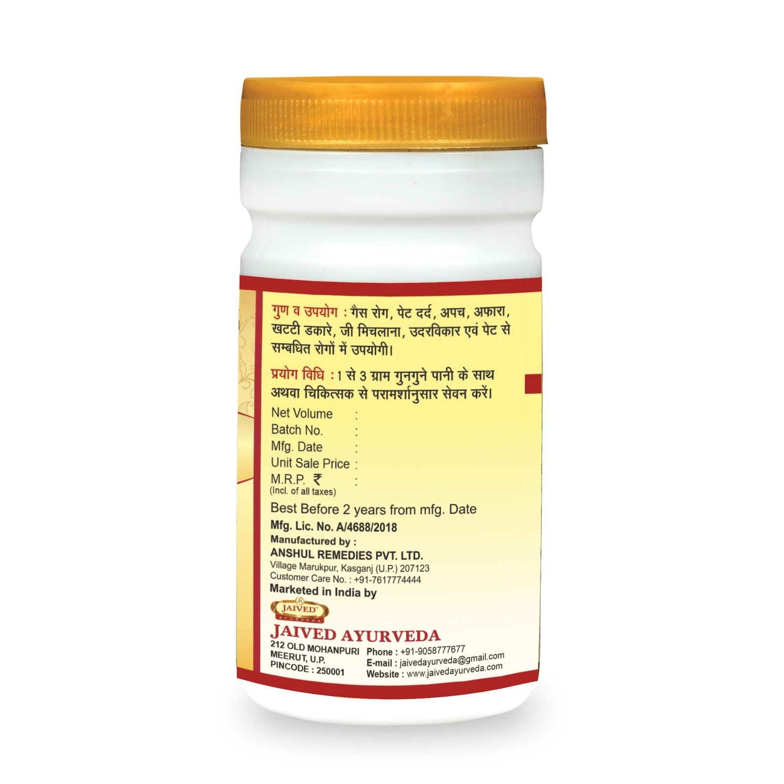 Key herbs include Ajwain, Hing (asafoetida), Saunf (fennel), Amla, Harad, and Kala Jeera.