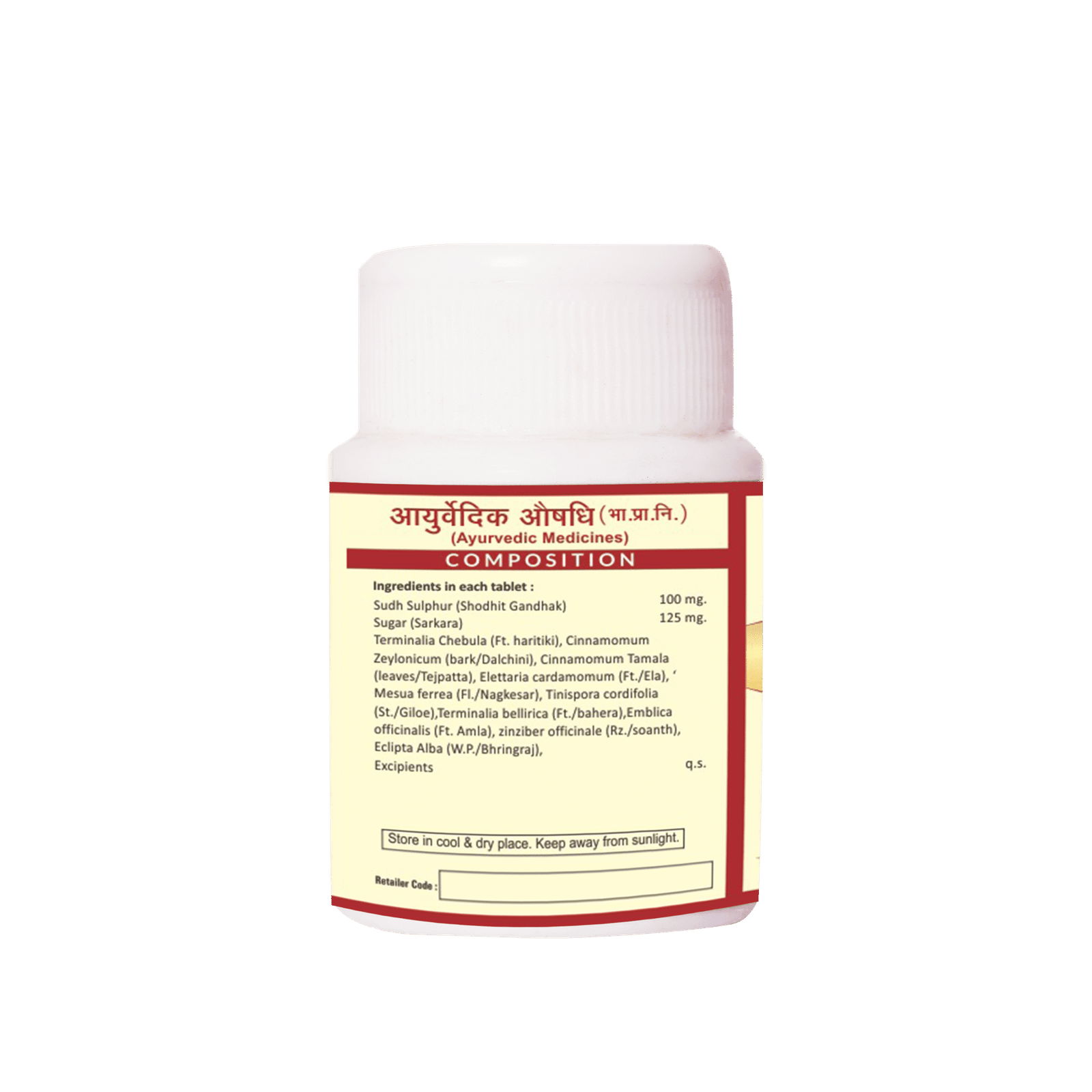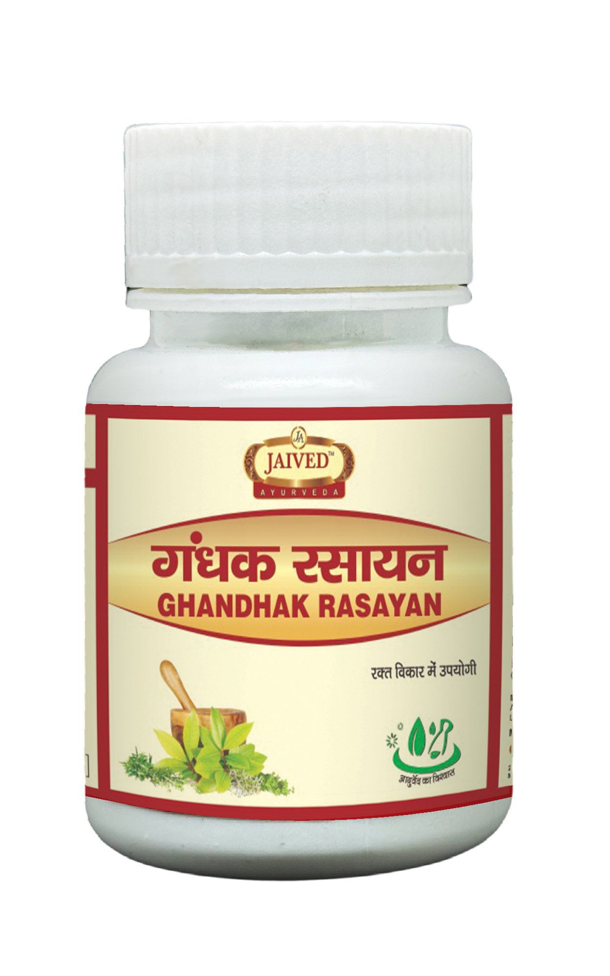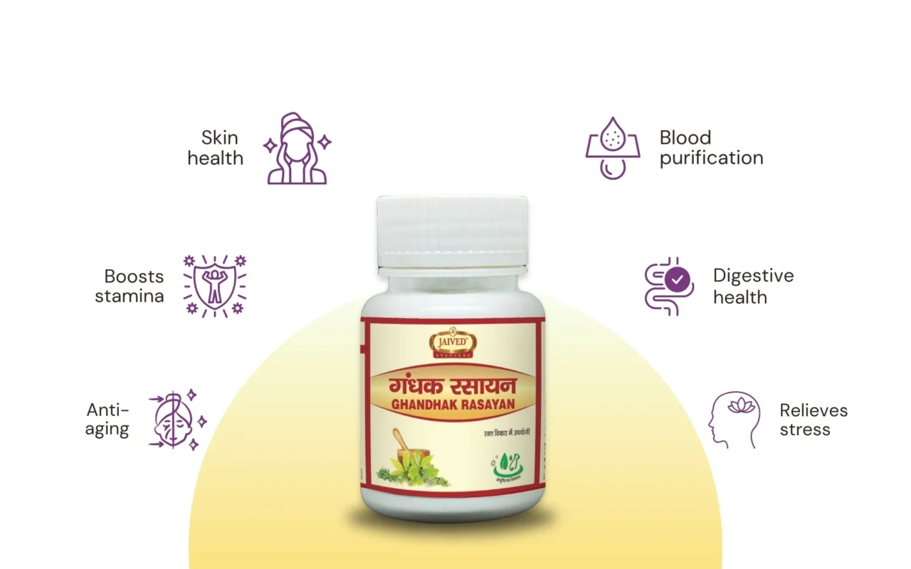 Gandhaka Rasayan An advanced Ayurvedic remedy featuring Dalchini, Tejpatta, Bahera, Bhringraj, and five other key herbs. Known for its detoxifying properties, it enhances immunity, supports skin health, and promotes overall vitality. Ideal for comprehensive wellness and balancing body functions.