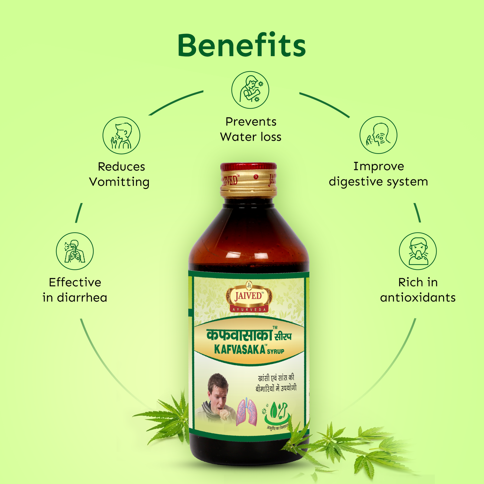 Experience the potent relief of Jaived Ayurveda Kafvasaka Syrup, a herbal concoction featuring 50+ ayurvedic herbs. This non-drowsy formula provides immediate relief from all types of cough without inducing sleepiness. Free from artificial colors or preservatives, it is a natural solution enriched with key ingredients like Sunthi, Banaphsa, Lavanga, Madhu, Tulasi, and Haridra. Alleviate cough and cold symptoms, improve hoarseness of voice, boost immunity, and enhance respiratory health with this holistic ayurvedic syrup.