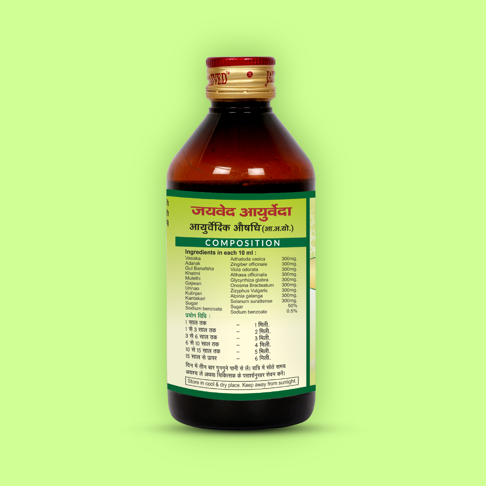 Jaived Ayurveda Kafvasaka Syrup, an herbal formulation enriched with the goodness of 50+ ayurvedic herbs, stands as a powerful remedy for various types of cough. Crafted with a non-drowsy formula, this syrup ensures immediate relief without inducing drowsiness. It is fortified with key ingredients like Sunthi, Banaphsa, Lavanga, Madhu, Tulasi, and Haridra, each contributing to its efficacy. This ayurvedic syrup is devoid of artificial colors or preservatives, making it a natural and holistic solution. Jaived Ayurveda Kafvasaka Syrup is designed to alleviate cough and cold symptoms, improve hoarseness of voice, boost immunity, and enhance overall respiratory health.